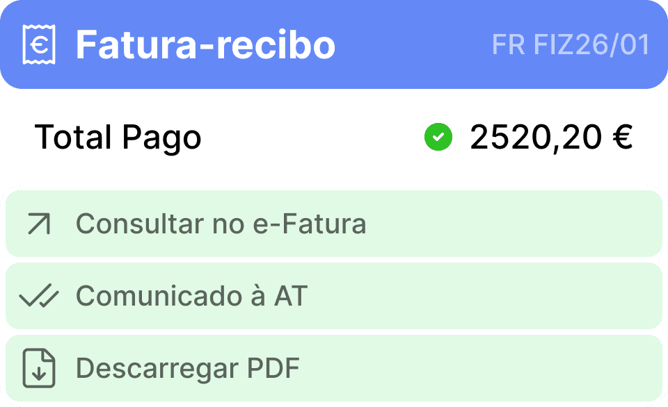 Na app, no site ou por WhatsApp. A fatura é comunicada automaticamente à Autoridade Tributária. Só faturas — o FIZ trata do resto.