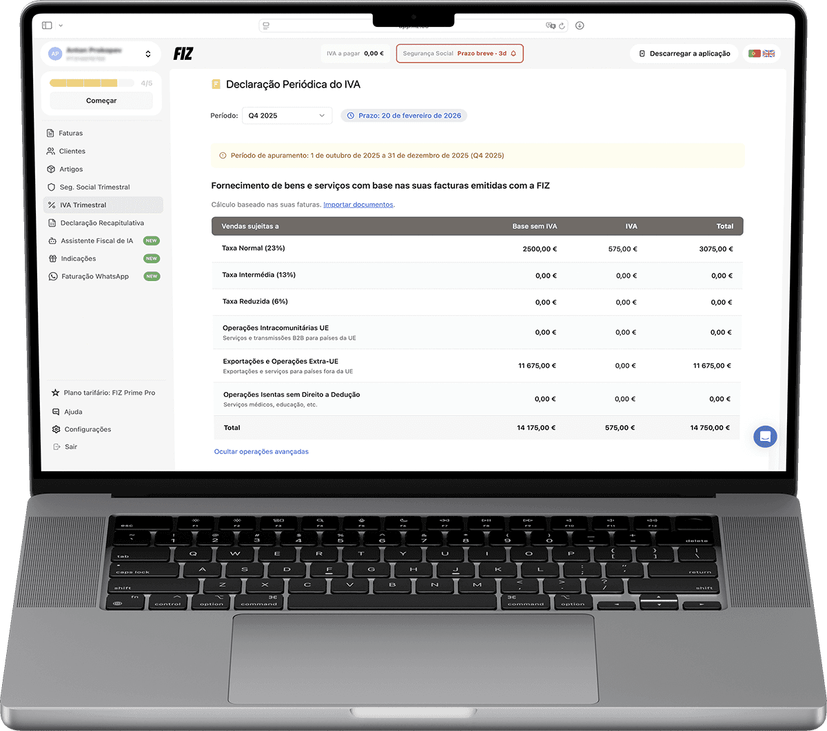 IVA, Segurança Social, contribuições — tudo calculado automaticamente. Quando chegar a altura, só confirmas e submetes. Sem erros, sem prazos perdidos.