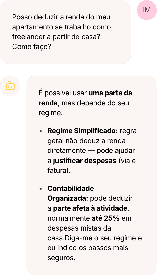 O nosso Consultor Fiscal com IA responde a qualquer questão sobre IVA, IRS, Segurança Social — por chat ou WhatsApp.