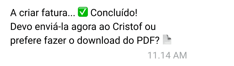 Crie e envie faturas no chat que já usa. Escreva ou fale — a fatura fica pronta.